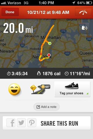 The biggest thing that made today bearable was when Emily offered to run the first half with me. I am forever grateful that she made the first ten miles fly by! Emily and I met at 59th and Lex and ran over to Riverside Park. It was gorgeous, but neither of us could really figure out where the park looped around, so for the most part we stayed along the water. We both had set our Nike + GPS and turned around once we hit six miles. We worked our way back down the West Side Highway along the Hudson until we hit ten miles. Emily is a pro and helped me to maintain a steady pace rather than being all over the chart and burning out after the first two miles. With her help I got through ten miles and at that point my body was pretty much on autopilot so I continued at the same pace all the way through twenty. I OWE YOU BIG TIME, EM!