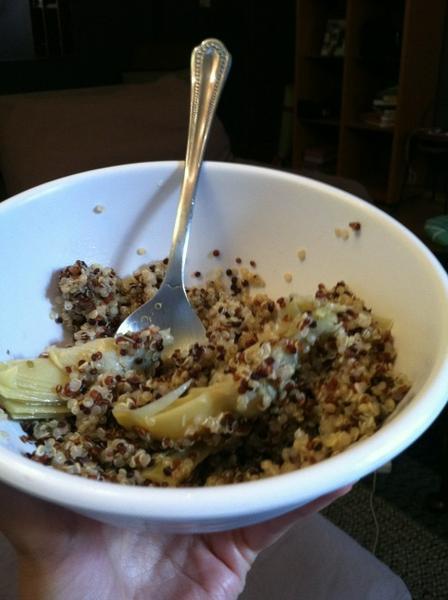 Once I finished I was famished. I felt like a Sim who’s hunger levels were on high alert. I wasn’t craving anything in particular but I desperately needed calorie consumption. Since the staple of my food cabinet is quinoa and I was in a rush to make my way to Hoboken to watch the Pats with Kate and Mol, I downed a quick bowl. I essentially could have devoured a house though, so I was already imagining my next meal.