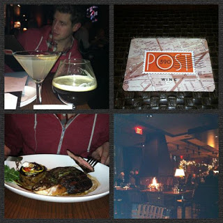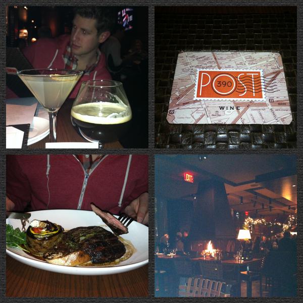 To continue the anniversary celebrations we decided to head into Boston for dinner and drinks. After my uncle recommended a full list of restaurants, we called and made a reservation at Post 390 located in Back Bay. Eric started with a 21st Amendment Fireside Chat and a Salad of Market Lettuces, which included poached pears and duck proscuitto. I started with the Pear Drink (I was sold when I saw that this included prosecco) and Lobster Buttercup Squash Bisque. The appetizers and drinks were delicious. For our main entrees Eric had the Char-Grilled Brandt Farm Skirt Steak and I had the Grilled Atlantic Salmon with mustrard dressed brussel sprouts. Everything was delicious. I made an attempt at being sophisticated by asking for wine recommendations while Eric glared at me for making small talk, but ultimately, we made our own decision and went with the Aquinas meritage wine. We didn’t have room for dessert, but we stayed and enjoyed the atmosphere while we finished our wine. It was a great 4 year celebration; better late than never!