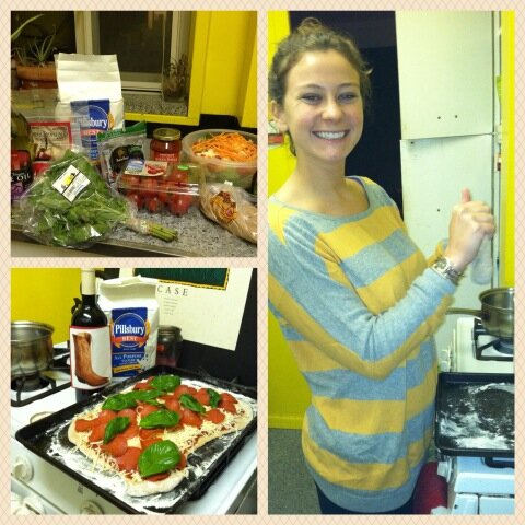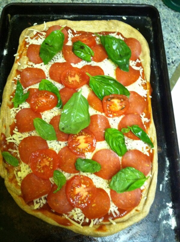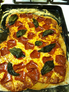 Even when I’m in a healthy phase or on a health kick, I have an undying love and craving for pizza.  Since this week was a little crazy for Ahnzie and me, we decided to stay in last night.  I wanted to tackle a few things that I put off throughout the past week, like the mound of laundry that was starting to torture me.  But, it was Friday after all so a makeshift pizza party was also in order.  Right now Trader Joe’s has whole wheat pizza dough (1 point for the healthy team), so we got whole wheat pizza dough, quattro formaggio cheese, fresh basil, low fat turkey pepperoni and “trader giotto’s” pizza sauce, and we threw it all together for a somewhat healthy version of  a Friday night pizza party.